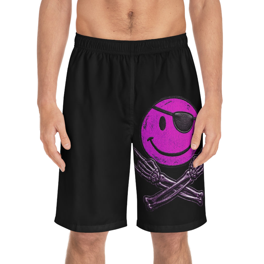 These board shorts bring a playful edge to warm-weather days. Lightweight, quick-drying polyester and an elastic drawstring waist keep movement easy whether you’re chasing waves or lounging at a bonfire. The deep black canvas makes the worn-yellow smiley-with-eyepatch and crossed skeletal hands pop — a cheeky, rebellious nod that wears like an inside joke among friends. Side pockets hold small essentials while the regular cut gives relaxed coverage without feeling baggy. Slip them on for surf runs, skate sessions, or backyard hangs when you want functional comfort with a little attitude.